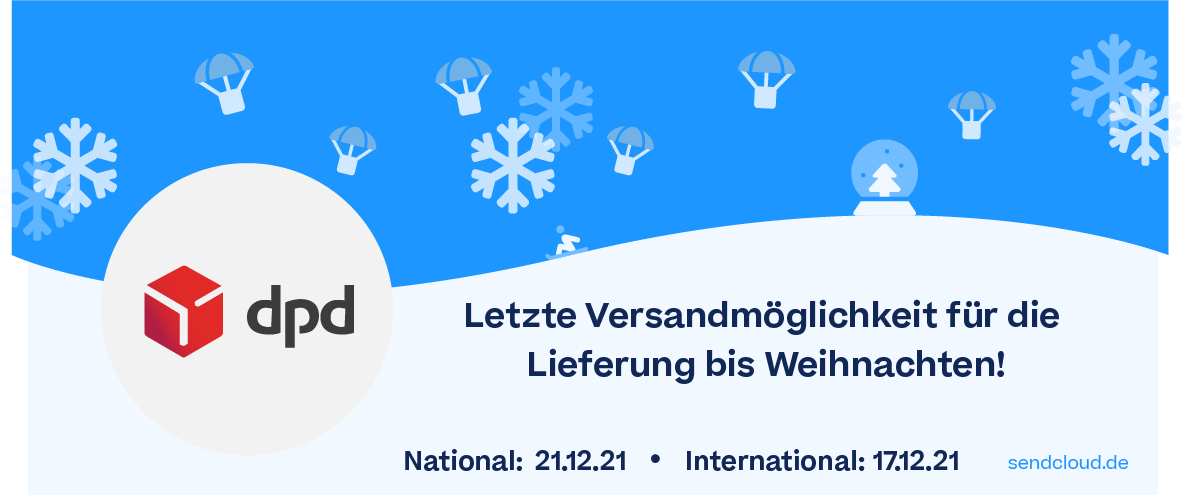 - Dienstag, 21. Dezember 2021: Standardpakete, dice bis spätestens 12 Uhr in einem DPD Paketshop abgegeben wurden, kommen i. d. R. bis Freitag, 24. Dezember 2021 via DPD Versand an.